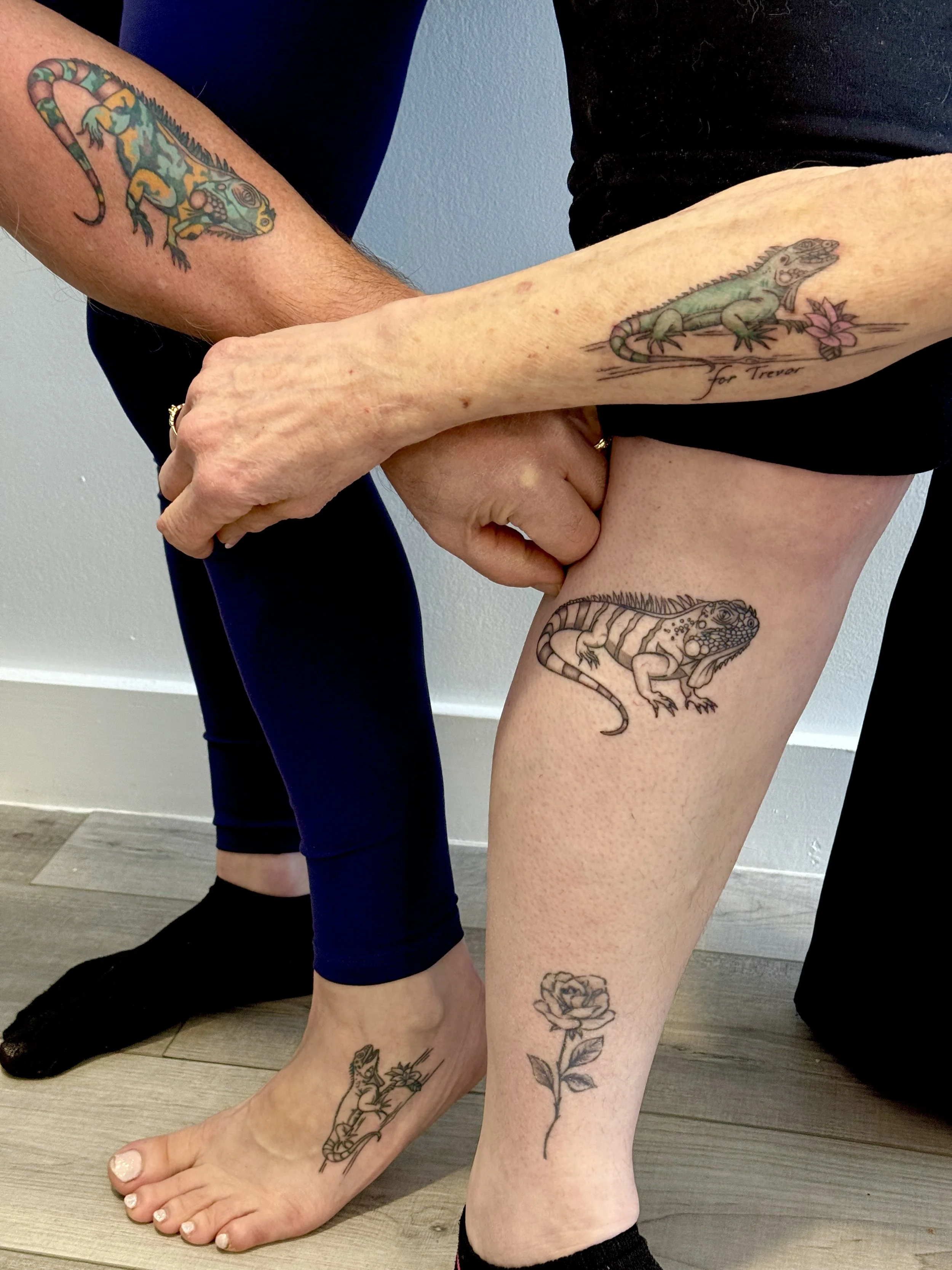 When we stumbled across Kerri's article in the newspaper about her shop that offered Cremation Tattoos, we felt that this would be the perfect tribute we could do as a family for Trevor. When we were trying to decide the type of tattoo to get, Trevor's Dad suggested an iguana tattoo or possibly something with camo print. When this was suggested, it felt like a lightbulb moment. That was it! What a wonderful opportunity it was to meet Kerri. We made an appointment, packed up a cooler of food and drink and made a family day of it, getting tattoos one after another. She made the experience remarkable, creating a beautiful memory while receiving sentimental tattoos.